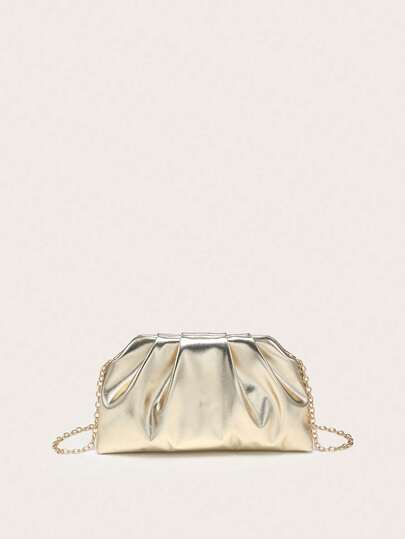 女士斜挎包,方形金色,褶皱PU材质,轻便时尚,金属链条肩带,适合晚间外出和购物。