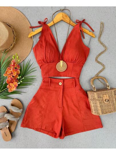 Women's Linen Crop Top And Short Set With Elastane - Summer Elegant Simple Casual Linen Knot Button Zipper Beach Set Holiday Spring Summer