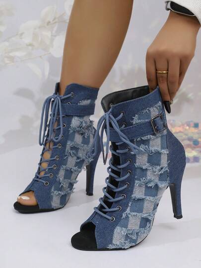 女士新款时尚亮面透气棋盘格牛仔系带拉链露趾防滑圆头细高跟踝靴,性感现代复古欧美风舞鞋,增高纯色高跟凉鞋