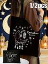斋月手提袋 - 伊斯兰开斋节礼物,包含单肩包和化妆包,白色无纺布手提包,印有斋月和开斋节图案,米色购物袋,可折叠便携耐用印花手提包,大容量耐用穆斯林包,适合旅行、购物、聚会、开斋节庆祝活动 - 送给朋友和家人的理想伊斯兰礼物,适合返校季、夏季、新年、斋月、开斋节、情人节、圣诞节或感恩节。