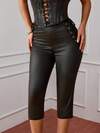 Apperloth A 女士PU皮革弹力高腰紧身涂层打底裤百慕大短裤侧边系带无口袋商务办公休闲春夏外出音乐节女装