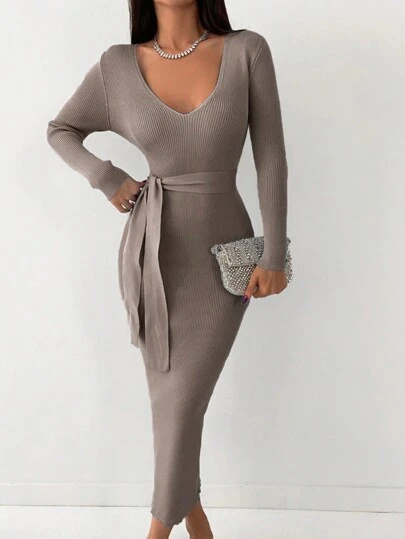 EURMUSE 女式优雅纯色修身毛衣裙,春秋装 - 摩卡棕 - 查看 1