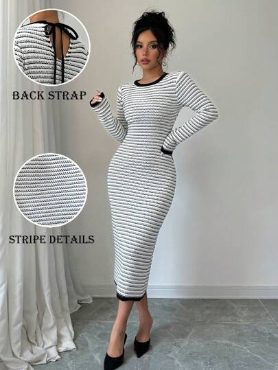 Chiquease 女式露背系带条纹修身针织紧身毛衣连衣裙 - 黑與白 - 查看 1