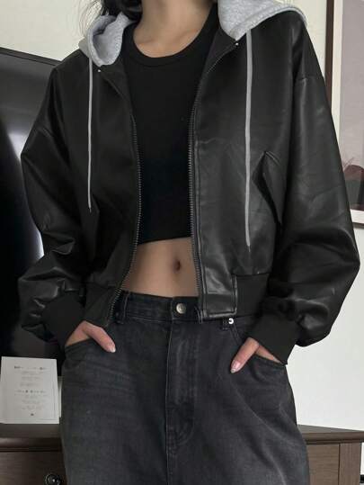 DAZY 女士休闲撞色落肩长袖拉链连帽宽松外套,春秋季皮夹克 - 黑色 - 查看 1