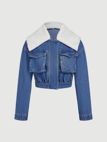 Selenza 女式休闲时尚撞色翻领翻盖口袋短款牛仔夹克,秋冬 - 藍色 - 查看 1
