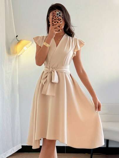Rafferiza 女士优雅交叉 V 领荷叶边袖系带 A 字连衣裙,适合通勤 - 杏色 - 查看 1