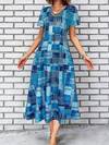 女士V领短袖蓝色几何格子拼接印花A字长连衣裙,休闲优雅透气舒适飘逸夏季长裙