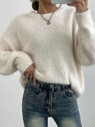 DAZY 女式蓬松宽松柔软套头毛衣、七分袖上衣秋冬 - 米色 - 查看 1