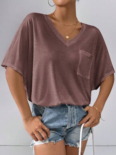 SHEIN Essnce 女士宽松蝙蝠袖 T 恤,采用竹纤维制成 - 紫紅色 - 查看 1