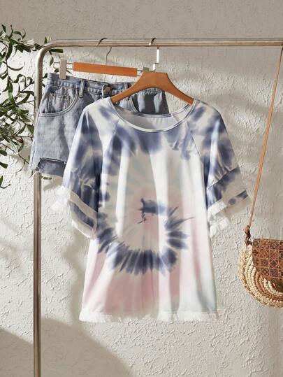 SHEIN LUNE 女士渐变色印花圆领多层袖 T 恤 - 藍白色 - 查看 1
