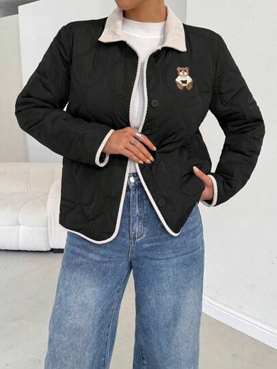 SHEIN Essnce 女式夹棉大衣,带熊刺绣、拼色和立领,适合秋冬季,女士冬装 - 黑色 - 查看 1
