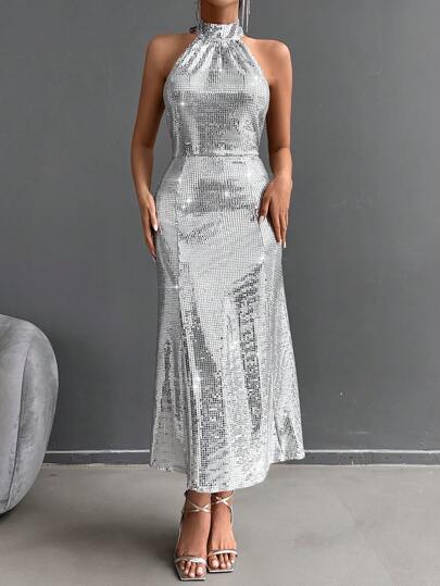 EURMUSE 女派對銀色亮片掛脖連身裙 - 銀色 - 查看 1