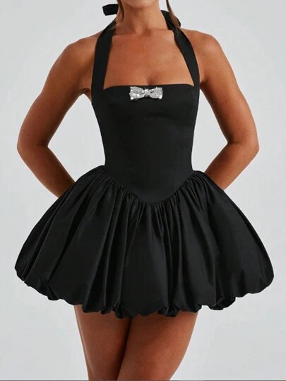 INAWLY 女士水钻蝴蝶结装饰露背派对迷你连衣裙,适合情人节穿着 - 黑色 - 查看 1
