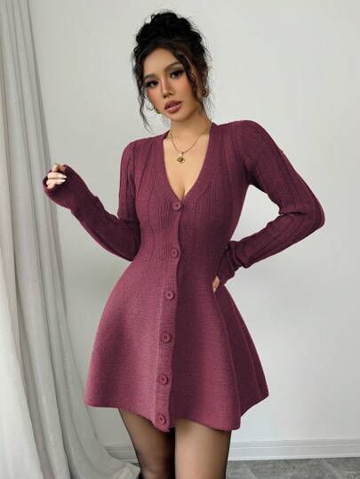 Selianne 女士纯色前排纽扣长袖休闲衬衫,日常穿着 - 酒紅色 - 查看 1