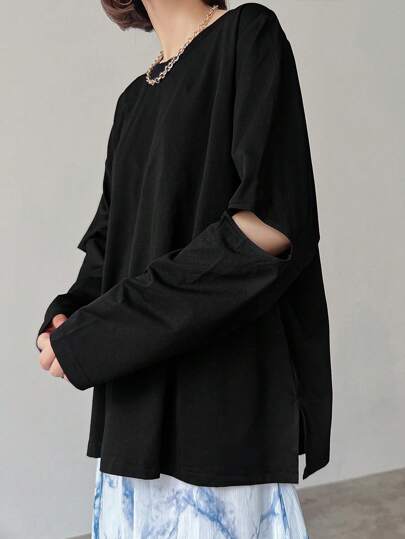 FRIFUL 女式纯色修身镂空袖T恤长袖女式上衣 - 黑色 - 查看 1