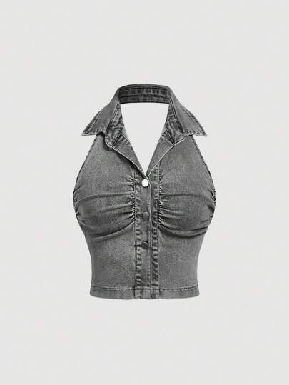 SHEIN MOD 女式纯色前扣无袖性感牛仔吊带背心 - 灰色 - 查看 1