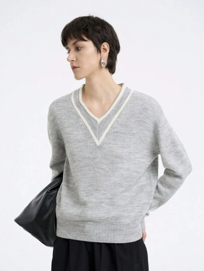 Aalyst 女士纯色拼接V领长袖休闲套头毛衣针织衫秋冬款 - 灰色 - 查看 1