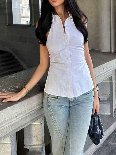 INAWLY 女士纯色单排扣休闲挂脖衬衫 - 白色 - 查看 1