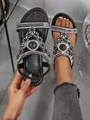 女士水钻装饰露趾平底凉鞋,夏季波西米亚风沙滩鞋