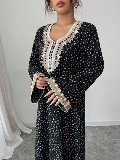 Yasmyna 女式编织花卉印花拼布领荷叶边宽松长袖阿拉伯连衣裙,端庄 - 黑色 - 查看 1
