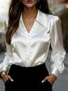 女士优雅白色缎面衬衫,常规长袖,衬衫领纽扣细节