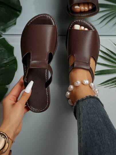 女士时尚新款拖鞋,舒适加大码镂空纯色露趾凉鞋,度假沙滩凉鞋 - 巧克力棕 - 查看 1