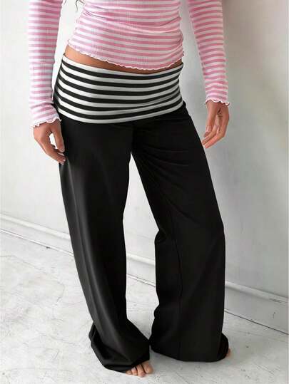Women Low Waist Loose Fit Striped Folds Over Wide Leg Pants Lounge Home Sweatpants