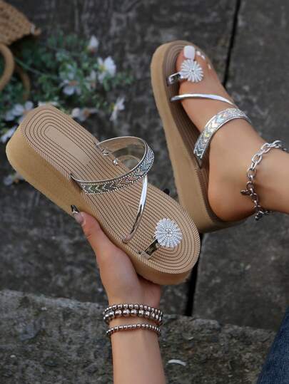 女士金屬質感水鑽裝飾夾腳坡跟度假夏天涼鞋 - 銀色 - 查看 1