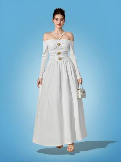 Poshira 女士露肩宴会礼服,独特设计,金属配饰,褶皱腰,正式晚礼服,女士春夏时尚派对聚会约会假日婚礼名人礼服,时尚腰部和大礼服,婚礼宾客礼服,舞会礼服 - 白色 - 查看 1