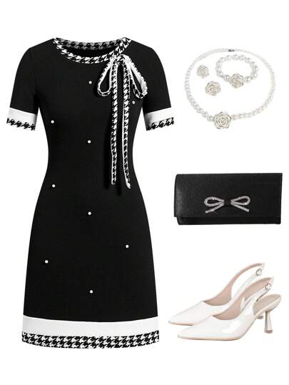 Ellevyn 女士珍珠装饰短袖连衣裙,春季 - 黑色 - 查看 1