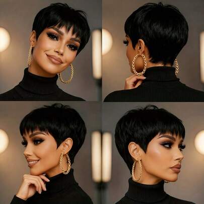 女士巴西 Remy 真人发假发 | 5 英寸自然短直发精灵头带刘海 - 180% 密度,无胶玫瑰网帽,无需维护,瞬间蓬松自然,敏感头皮友好,日常佩戴短发替代品。 - Natural Black - 查看 10