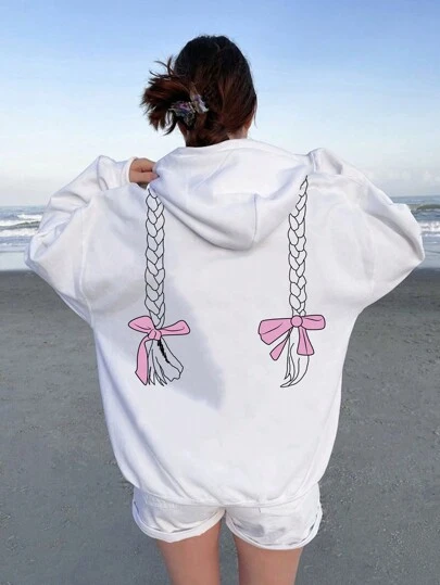 SHEIN EZwear 女士帶蝴蝶結印花連帽毛絨衛衣 - 白色 - 查看 1