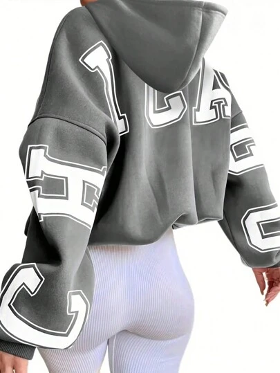 SHEIN EZwear 女士字母印花束口帽下垂肩運動衫 - 淺灰色 - 查看 1