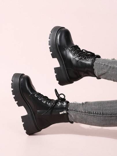 女士新款春秋黑色時尚、舒適、優雅的踝靴和短靴,側邊拉鍊細節,圓頭設計,厚實大底 - 黑色 - 查看 1