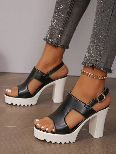 女性大尺碼歐美風夏季高跟涼鞋,時尚黑色厚底耐水平台女鞋 - 黑色 - 查看 1