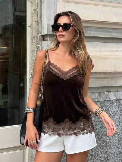 女士复古蕾丝边天鹅绒吊带露脐短款上衣,性感露脐,适合派对穿着 - 咖啡棕 - 查看 1