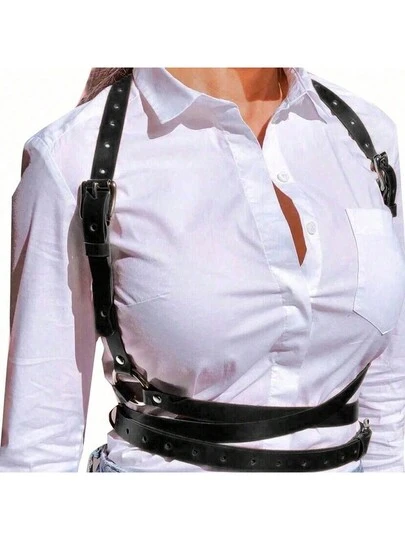 女士腰帶可調節肩帶身體束縛粉紅色人造皮革復古束腰 - 黑色 - 查看 1