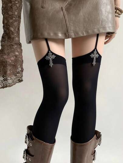 女士3D交叉吊带过膝袜,洛丽塔风格,天鹅绒材质,纯黑白配色,Y2K风格,舒适长袜,家居礼物,浪漫情侣装 - 彩色 - 查看 1