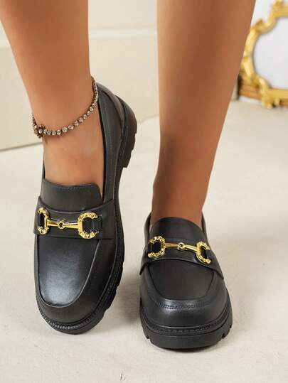 女士搭扣设计平底乐福鞋,时尚黑色(鞋面有花纹属正常现象) - 黑色 - 查看 1