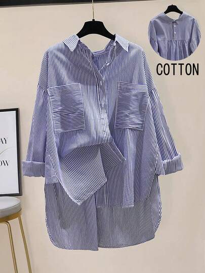 女士休闲棉混纺条纹前后开襟长袖衬衫,宽松版型,前短后长设计 - 藍白色 - 查看 2