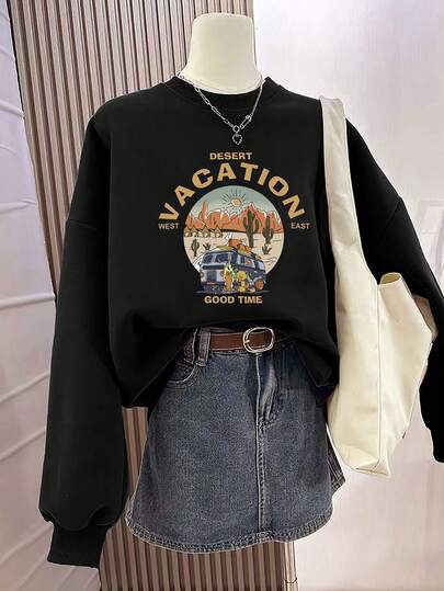 女士休闲长袖圆领卫衣,印花图案,面料柔软舒适,可机洗,春秋季上衣,套头连帽衫,时尚宽松版型 - 黑色 - 查看 1