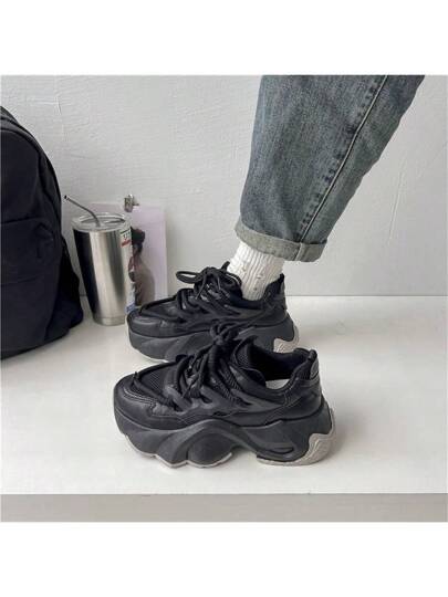 女款厚底運動鞋,新款時尚透氣網眼運動鞋,厚實底部,百搭加高設計 - 黑色 - 查看 1