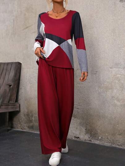 EMERY ROSE 女士色塊t恤和褲子套裝 - 紅色 - 查看 1