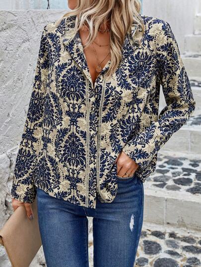 SHEIN Clasi 女式錦緞印花襯衫 - 藍色 - 查看 1