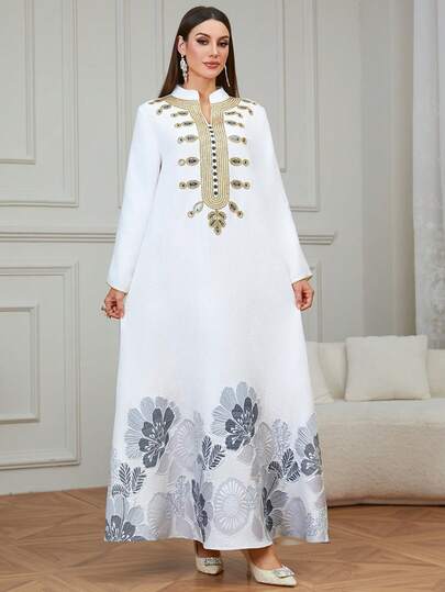女士优雅黑白提花长款金色绳绣长袍,适合开斋节、家庭聚会、约会、日常穿着 - 黑與白 - 查看 1