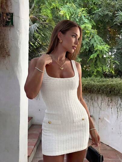 女士优雅时尚纹理方领金属扣修身白色针织连衣裙,女士夏季连衣裙,派对连衣裙,婚礼宾客连衣裙,毕业典礼连衣裙,女士优雅连衣裙,正式连衣裙,白色连衣裙