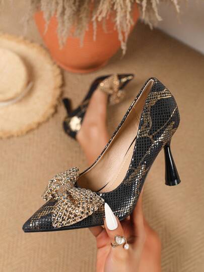 女士优雅高跟鞋,蛇纹尖头设计,饰以水钻蝴蝶结,百搭舒适,9厘米锥形鞋跟,适合四季通勤,舒适百搭,可用于办公室、外出、约会派对等场合。