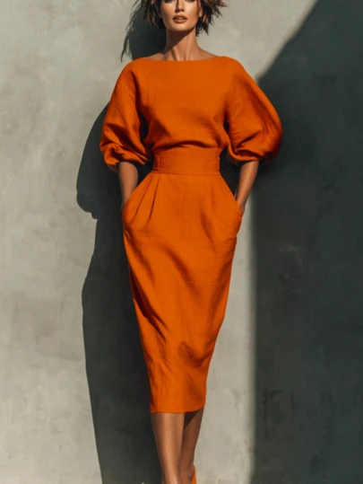 6. 女士优雅橙色中长连衣裙,船领,七分袖,带口袋