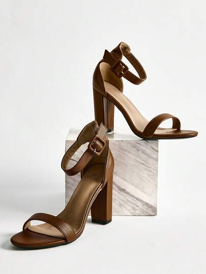 女士时尚新款舒适晚宴度假裸带方扣粗跟罗马凉鞋圣诞节冬季圣诞礼物 - 棕色 - 查看 1
