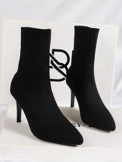 女性時尚簡約風&優雅針織尖頭高跟彈力靴 - 黑色 - 查看 1